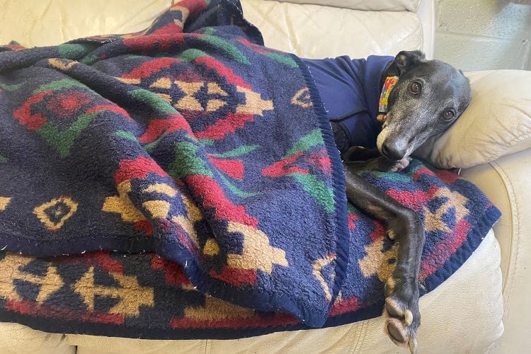 🐶 Good news! Bobby the greyhound found his forever home after waiting at a U.K. shelter for over 1,000 days. Look at this sweet boy all snuggled up in his blanket. 🥰
